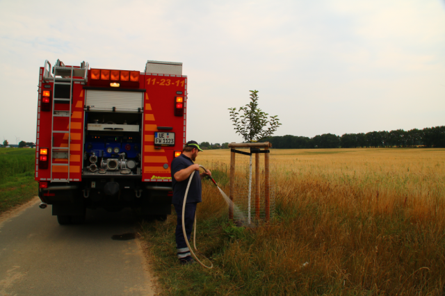 Die große Trockenheit der letzten Tage gefährdet nicht nur Wald und Flur durch Flächenbrände, sondern auch Neuanpflanzungen. Die in der Gemeinde Wriedel neu angepflanzten Obstbäume an vielen Wegen der Gemeinde brauchten dingend eine Bewässerung.