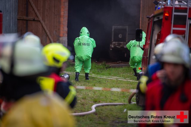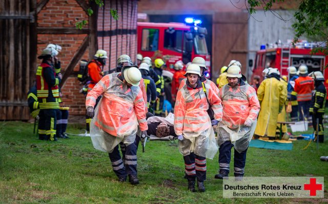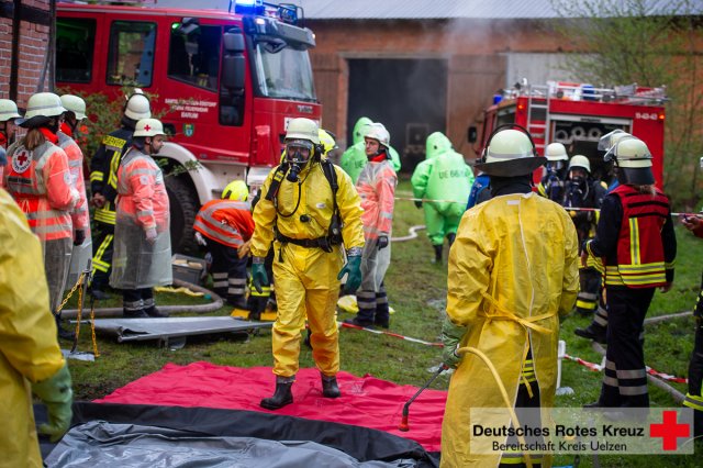 Knapp 100 Einsatzkräfte von der DRK Bereitschaft Kreis Uelzen sowie der Feuerwehr aus Gloste in Natendorf, dem 2. Fachzug Nord und dem Gefahrgutzug Nord probten am 09 Mai 2019 auf dem Gelände den Ernstfall. Angenommen wurde ein Schwelbrand in einer der Scheunen.