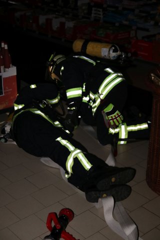 Die im Bereich der Leergutannahme vermisste Person wurde vom Angriffstrupp, mit Hilfe der Wärmebildkamera, sehr schnell gefunden. Die Wärmebildkamera ermöglicht es, auch in verqualmten Räumen, eine auf dem Boden liegende Person durch die unterschiedlichen Temperaturen auf dem Bildschirm sichtbar zu machen. Der gerettete Mitarbeiter hat zu viel Brandrauch eingeatmet und war nicht ansprechbar.