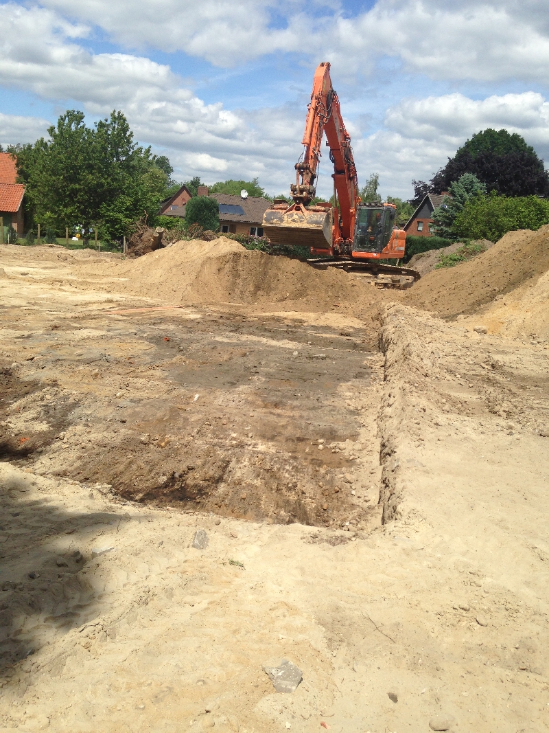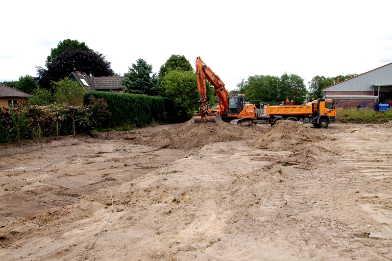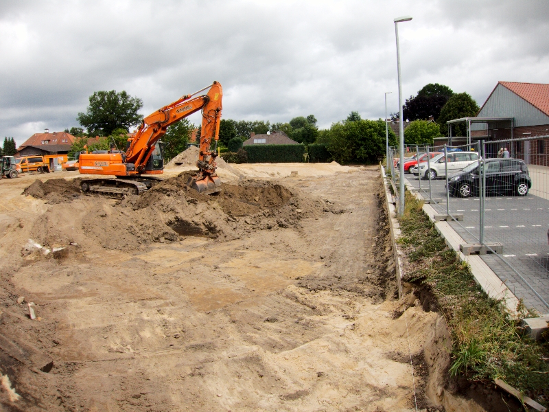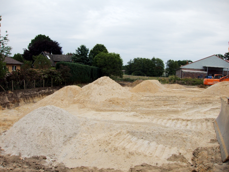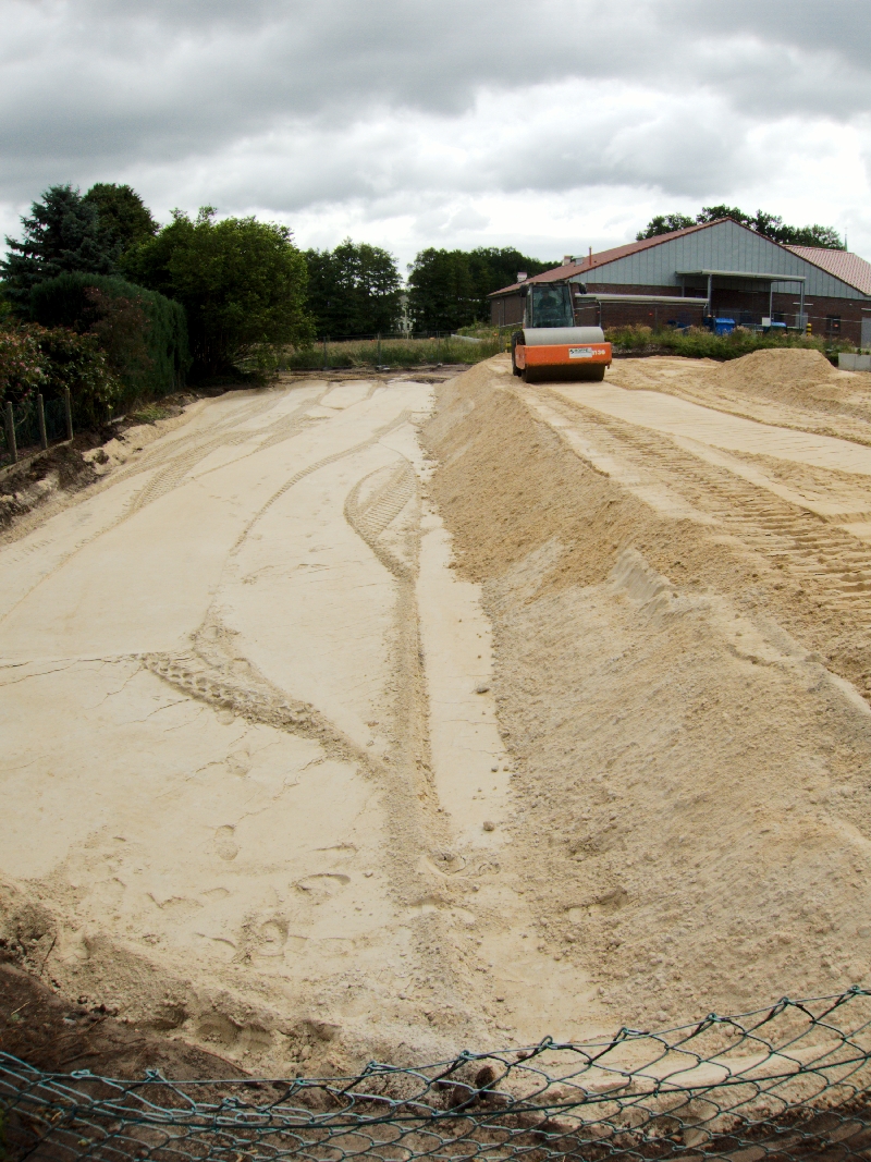 Die Muttererde wurde abgetragen und mit Sand aufgefüllt. Die Kanalisation die zuvor quer über den Parkplatz des Feuerwehrhauses verlief muss verlegt werden damit sie nicht „unter“ dem neuen Feuerwehrhaus verläuft. Erst wenn diese Arbeiten abgeschlossen sind können die Planum Arbeiten abgeschlossen werden.