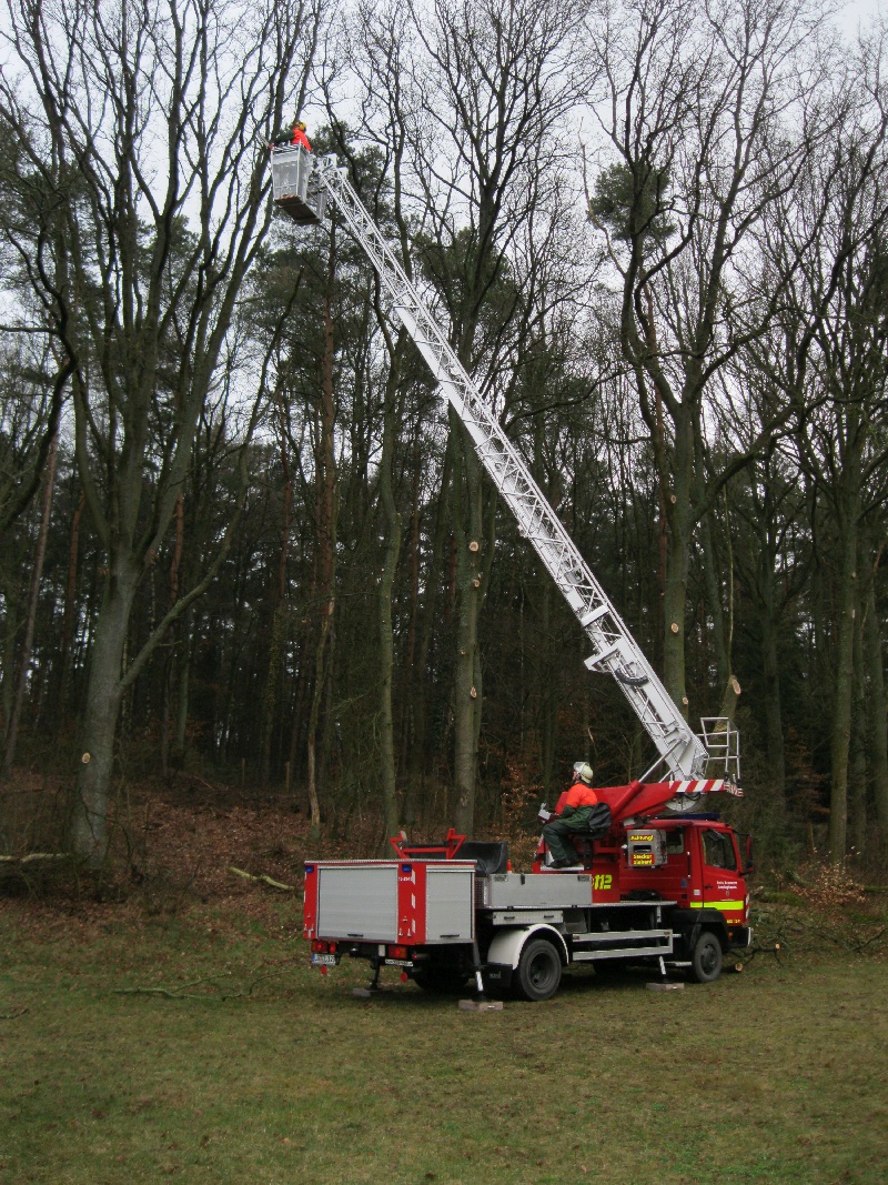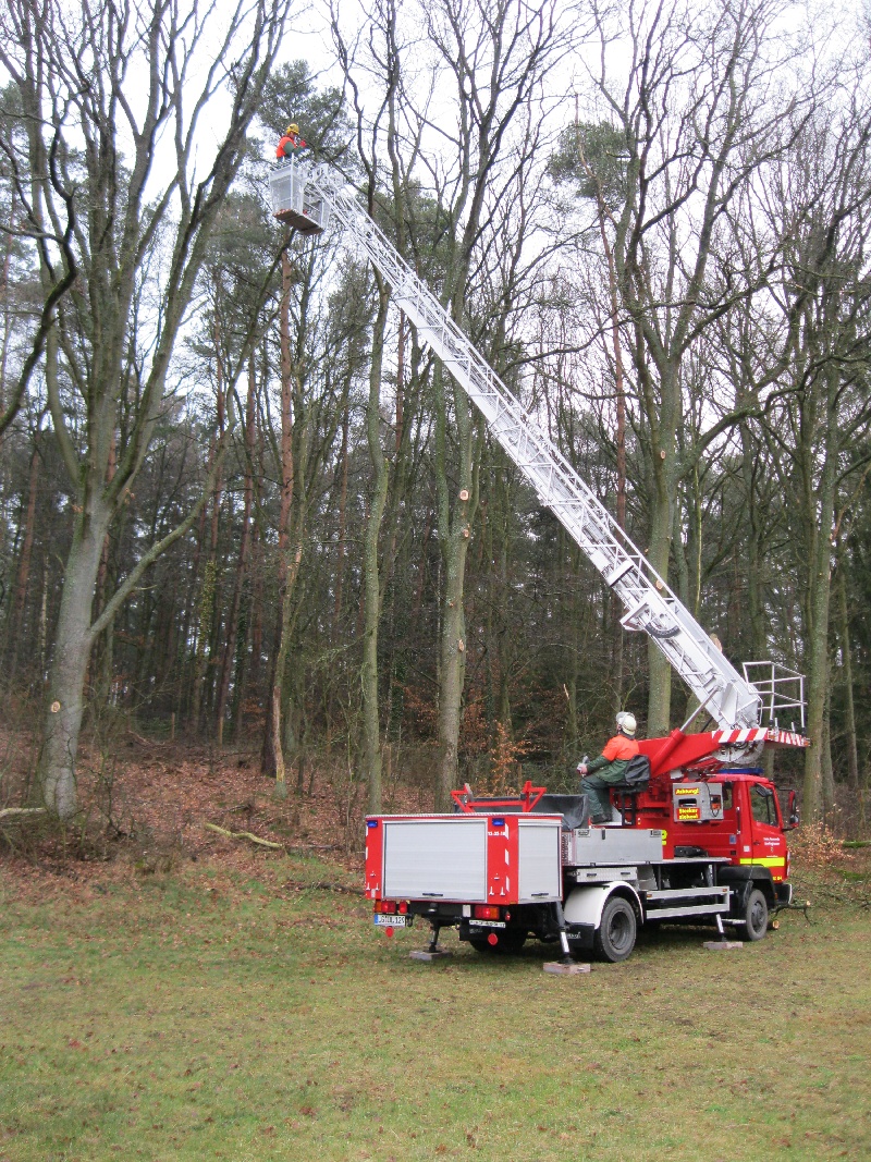 Diese Aufgabe übernahm unsere Nachbarwehr Amelinghausen die mit ihrer Drehleiter die Gelegenheit nutzten einen Ausbildungsdienst zu absolvieren. Nicht immer bietet sich die Möglichkeit den Umgang mit der Kettensäge im Drehleiterkorb zu üben.