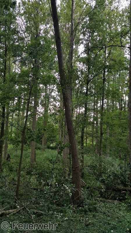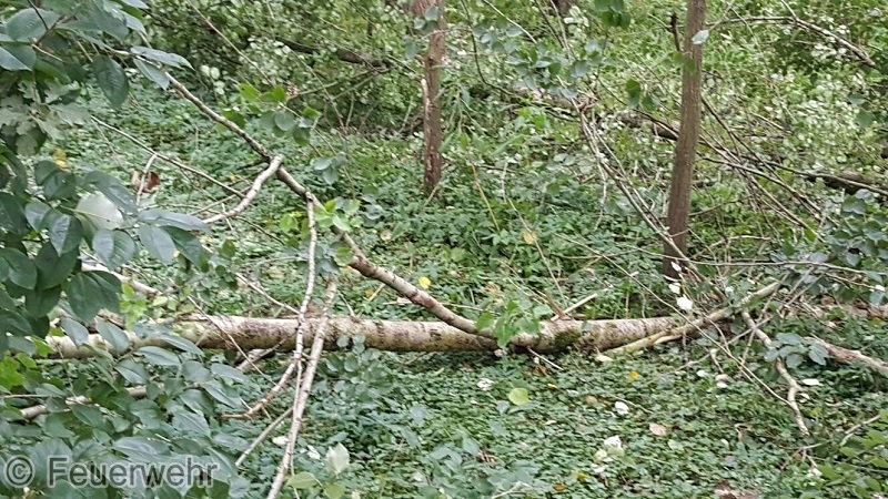 An der Einsatzstelle sind zwei Bäume entwurzelt und aneinander aufgegangen. Ein dritter Baum war auf einer Höhe von ca. 1,50m angebrochen. Die zwei entwurzelten Bäume würden mit der Kettensäge abgesägt und von der Straße geräumt.