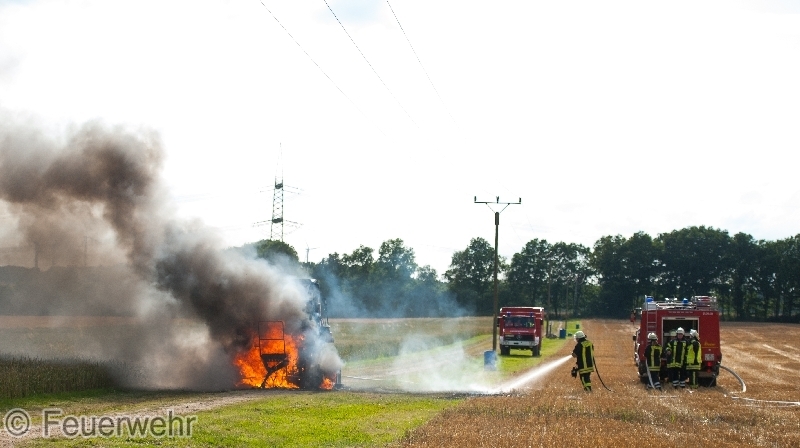 Eigene Löschversuche des Fahrers konnten das Ausbreiten der Flammen jedoch nur kurzfristig verhindern. Mit seinem Gespann fuhr er geistesgegenwärtig auf einen naheliegenden Feldweg und trennte die Presse vom Trecker. Somit konnte vermutlich ein ausbreiten der Flammen auf das Stoppelfeld verhindert werden.