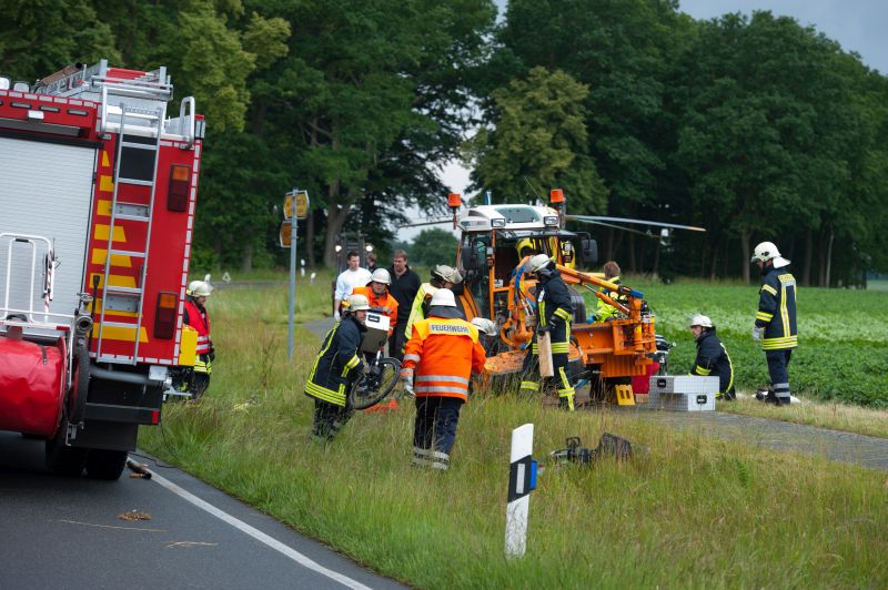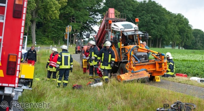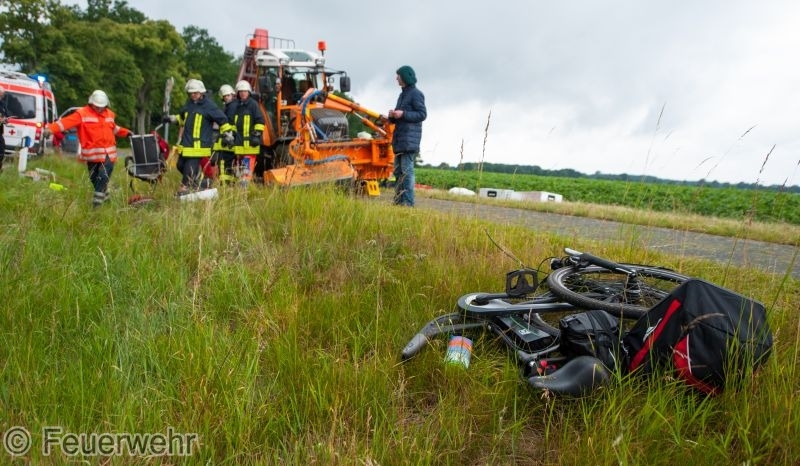 Eine E-Biker-Fahrerin war auf dem Fahrradweg von Brockhöfe Bhf. in Richtung Brockhöfe unterwegs. In Höhe der Abzweigung zur K 46 wurde die Radfahrerin von einem rückwärtsfahrenden Trecker, der mit einem Mähwerk ausgerüstet war, erfasst und unter dem Trecker eingeklemmt.