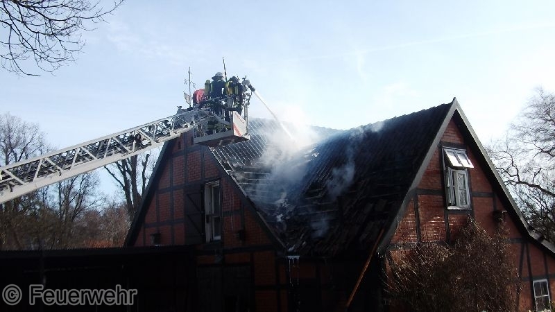 Freigelegte Brandnester wurden mit 1 C-Rohr bekämpft. Zusätzlich wurde ein Innenangriff über die Wohnung im 1. OG vorbereitet. Das Feuer breitete sich im Bereich der Isolierung weiter aus, so daß die Dachhaut weiträumig aufgenommen wurde.