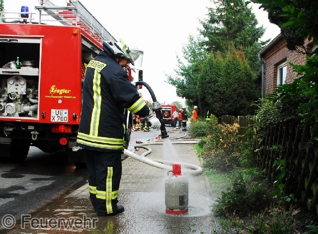 Einsatzleiter Ralf Marzowka ließ daraufhin die Drehleiter aus Uelzen anfordern, um unter anderem das Dach teilweise abdecken zu können. So konnte die Gefahr einer Durchzündung erheblich gesenkt werden.