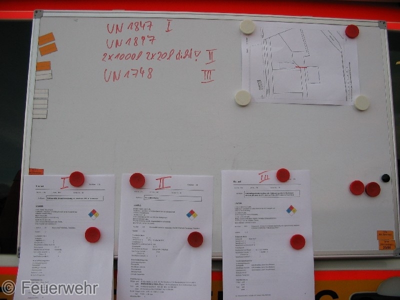 Als Übungsszenario wurde den Einsatzkräften ein verunglückter LKW mit diversen Gefahrstoffen auf der Ladefläche vorgegeben. Einige der Behälter auf dem LKW waren durch den Unfall umgekippt und / oder Leck geschlagen.