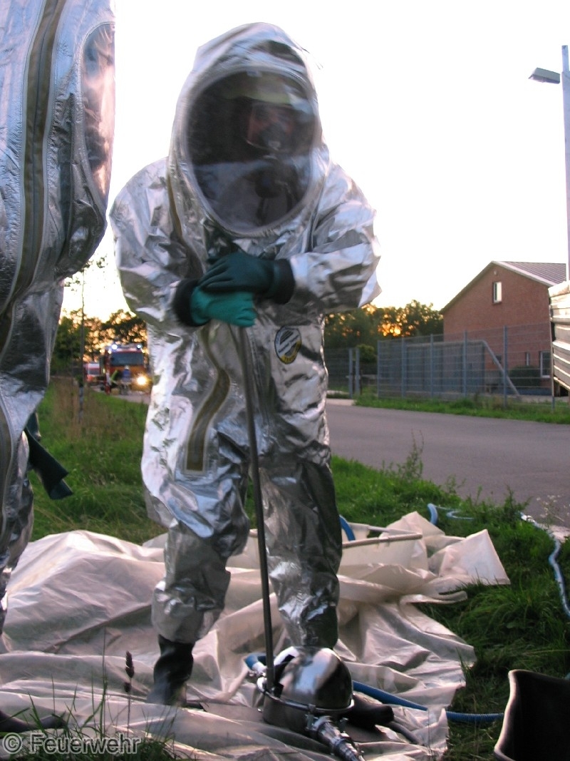 Im weiteren Verlauf trafen dann die weiteren Einsatzkräfte aus Ebstorf, Bad Bevensen und Bienenbüttel nebst Abrollbehälter aus Uelzen am Unfallort ein. Es wurde eng auf der Strasse im Gewerbegebiet. Schnell wurden weitere Einsatzkräfte mit CSA Anzügen ausgerüstet und eingesetzt.