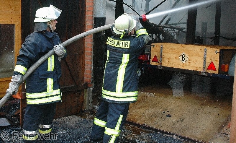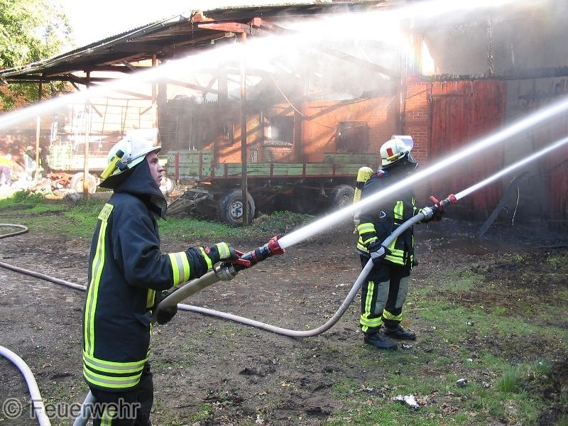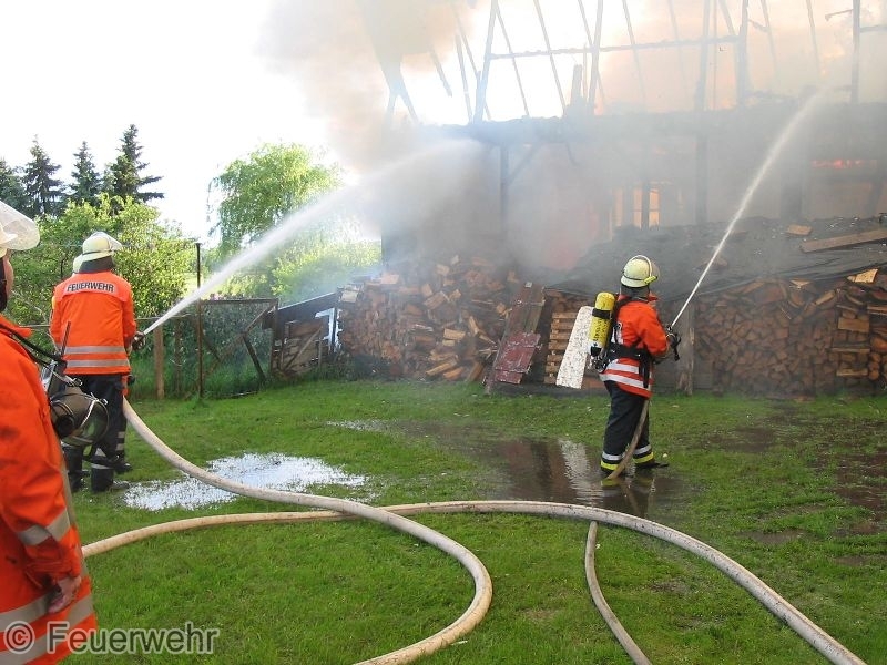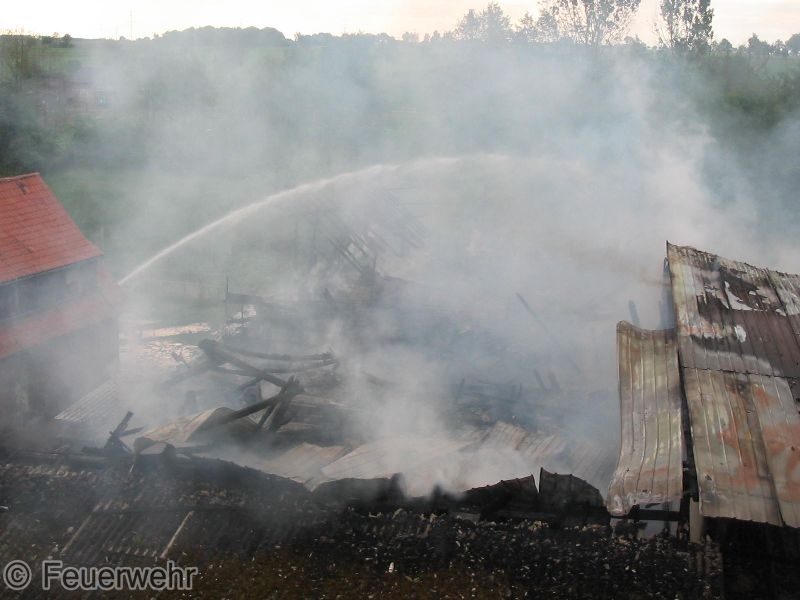 Im Minutentakt rückten weitere Brandschützer aus den umliegenden Orten an. Mit einem massiven Löschangriff von mehreren Seiten konnte schließlich das gefürchtete Übergreifen der Flammen auf ein nahe gelegenes Wohngebäude verhindert werden. Zweite Instanz war das Kühlen eines Propangasbehälters, welcher sich ebenfalls in der Nähe der Scheune befand. Dank der guten Wasserversorgung konnten zeitweise bis zu fünf C- und vier B-Rohre vorgenommen werden.