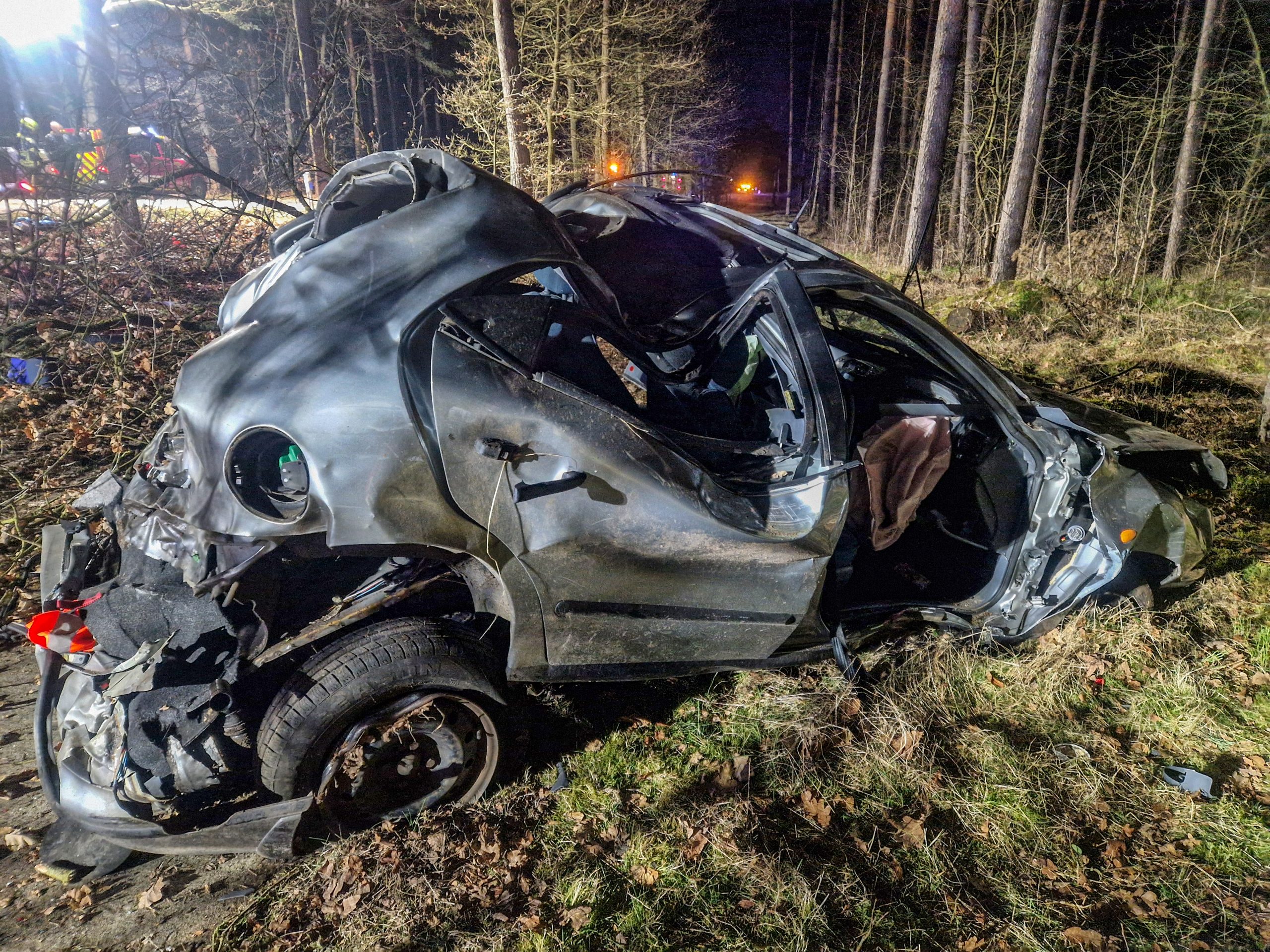 Ein Pkw war aus bislang ungeklärter Ursache von der Fahrbahn abgekommen und kam stark deformiert abseits der Straße zum Stillstand. Beim Eintreffen der ersten Einsatzkräfte befand sich eine Person noch eingeklemmt im Fahrzeug.