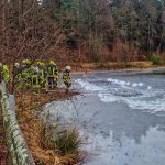 Nach dem Eintreffen der ersten Kräfte wurde die Einsatzstelle erkundet. Zur Eigensicherung wurde eine Steckleiter auf die Eisfläche aufgelegt, um ein sicheres Vorgehen zu gewährleisten. Anschließend wurde das Eis im Bereich der vermeintlichen Einbruchstelle geöffnet.