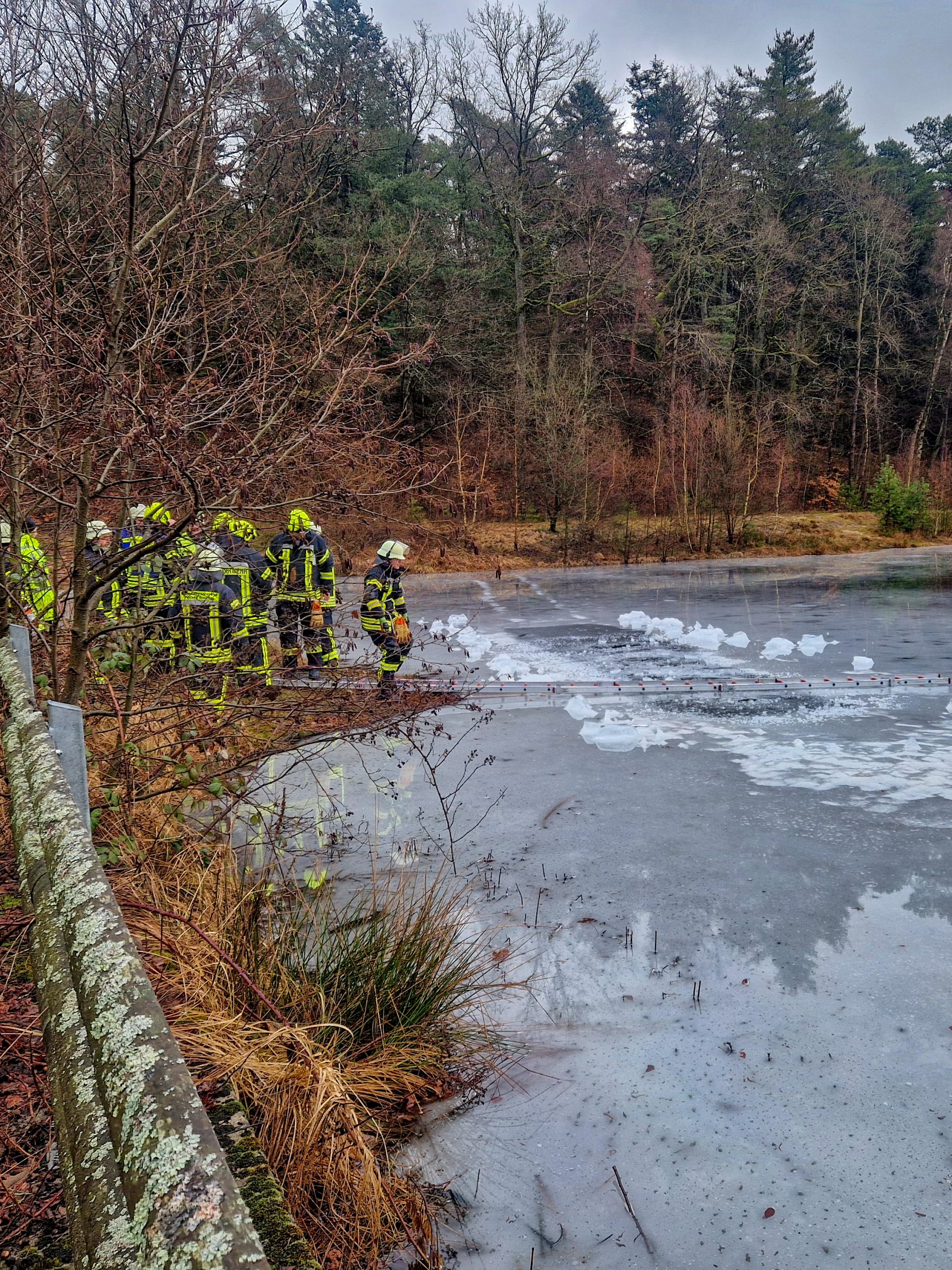 Nach dem Eintreffen der ersten Kräfte wurde die Einsatzstelle erkundet. Zur Eigensicherung wurde eine Steckleiter auf die Eisfläche aufgelegt, um ein sicheres Vorgehen zu gewährleisten. Anschließend wurde das Eis im Bereich der vermeintlichen Einbruchstelle geöffnet.