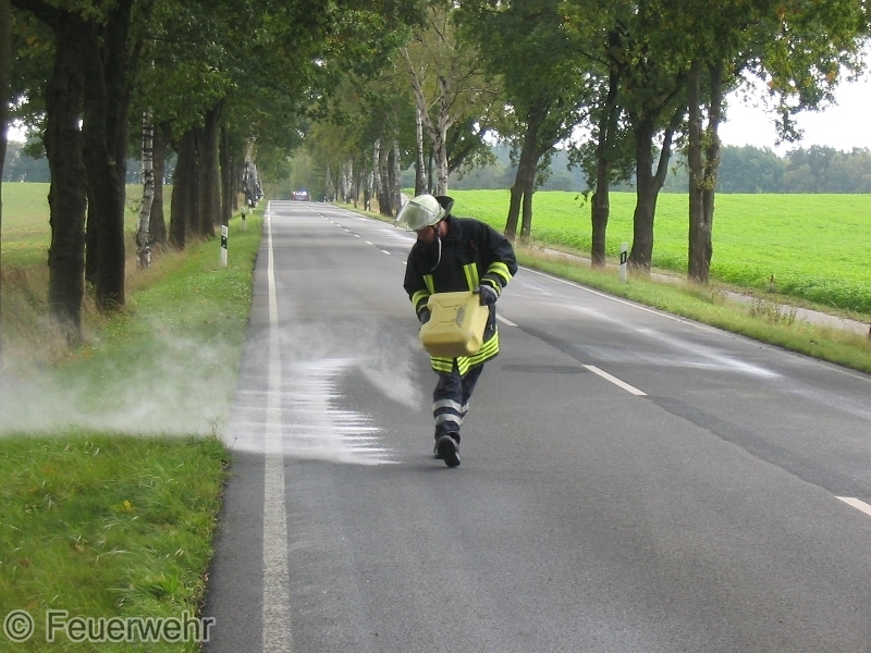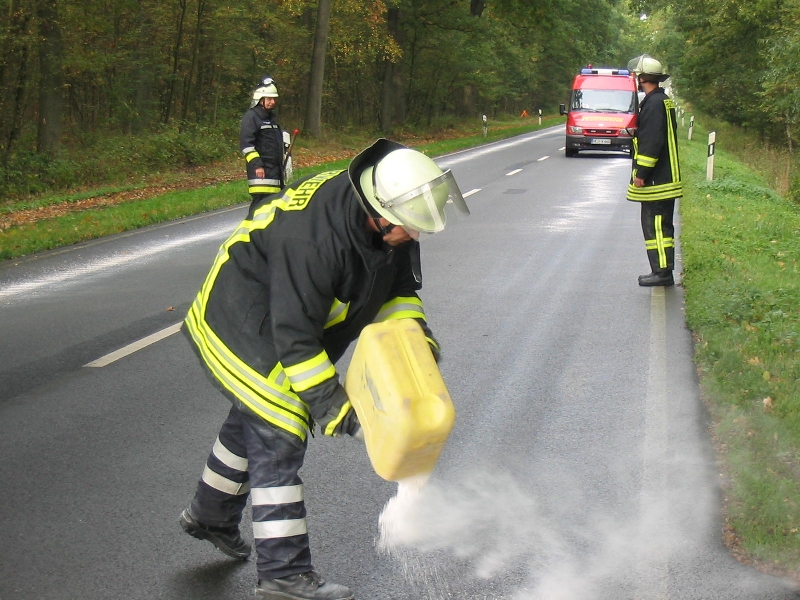 Die Ölsur, die teilweise auf beiden Fahrbahnseiten vorhanden war, wurde mit 20 Sack Ölbindemittel abgestreut.