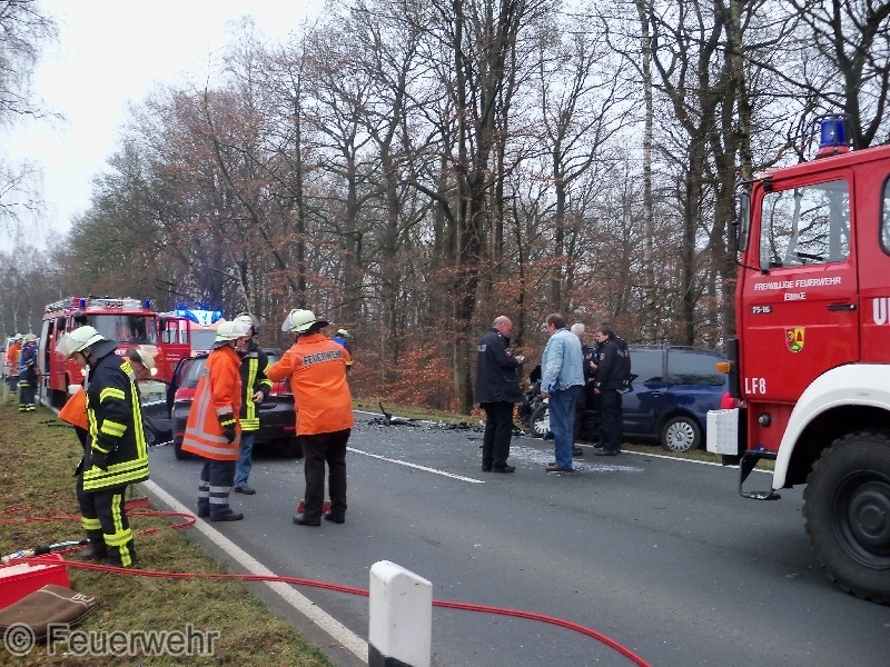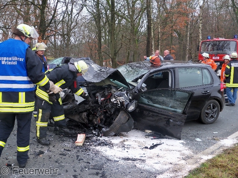 Die Feuerwehren aus Eimke und Wriedel wurde um 12:51 zu diesem Einsatz alarmiert, Einsatzstichwort war Verkehrsunfall eine Person eingeklemmt. Die hydraulischen Rettungsgeräte der FF Eimke und FF Wriedel-Schatensen mussten nicht mehr eingesetzt werden weil die Fahrer aus den Wracks auch ohne den Einsatz dieser Geräte gerettet werden konnten.