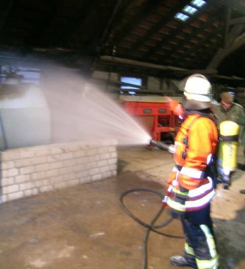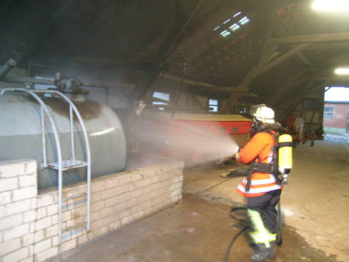 Als diese Versuche jedoch vergeblich waren, unternahmen sie weitere Löschversuche mit Wassereimern. Die Leitstelle löste derweil Alarm für die Feuerwehren Natendorf, Hohenbünstorf, Velgen, Wriedel, Ebstorf und Varendorf aus, zusätzlich wurde noch ein Rettungswagen aus Bad Bevensen alarmiert. Schnell erreichten die ersten Einsatzkräfte der Feuerwehr die Brandstelle. Die Mitarbeiter des Betriebes hatten das Feuer jedoch bereits selber soweit unter Kontrolle bringen können, dass Einsatzleiter Heino Meyer, nach der ersten Lageerkundung, einen Grossteil der alarmierten Wehren abbestellen konnte.