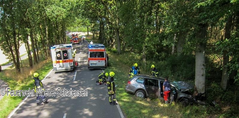 Zu einem tragischen Verkehrsunfall kam es in den Mittagsstunden des 21. August 2018 auf der Landesstraße 233 zwischen Velgen und Oetzfelde. Nach derzeitigen Ermittlungen der Polizei, hatte ein aus Richtung Velgen kommender 33 Jahre alter Fahrer eines Pkw gegen 13:00 Uhr die Kontrolle verloren, kam in einer leichten Rechtskurve nach links von der Fahrbahn ab und kollidierte frontal mit einem Baum. Der Mann verstarb noch am Unfallort und musste durch die alarmierten Feuerwehren aus Ebstorf, Wriedel-Schatensen und Velgen aus dem Fahrzeugwrack geborgen werden. Seine 26 Jahre alte Beifahrerin sowie ein 4 Monate alter Säugling erlitten ebenfalls schwerste Verletzungen und wurden mit einem Rettungswagen ins Klinikum nach Lüneburg gebracht.