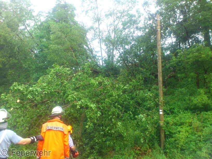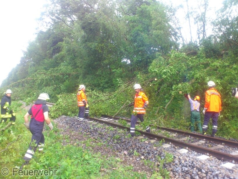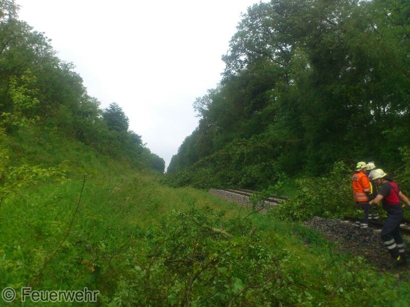 Zusammen mit der Feuerwehr Brockhöfe wurden mehrere Bäume beseitigt. Im Einsatz waren zwei Kettenmotorsägen. Die EST wurde dem Notfallmanager der Bahn übergeben. Ein Baum konnte nicht beseitigt werden da er durch seine Lage zu sehr unter Spannung stand und eine Gefährdung der Einsatzkräfte nicht ausgeschlossen werden konnte.
