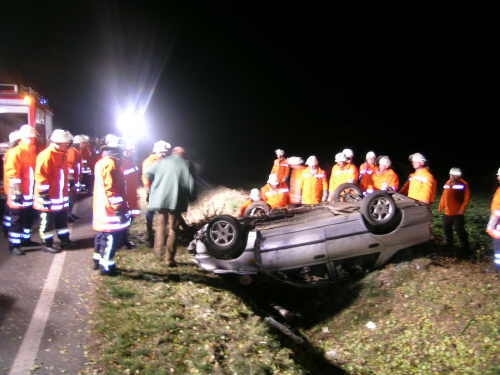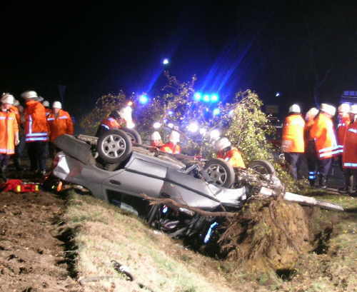 Kopfüber blieb der total zerstörte Wagen im Straßengraben liegen. Die Birke wurde durch die Wucht des Aufpralles komplett umgerissen. Bis zum Eintreffen des mitalarmierten Rettungsdienstes versorgten Einsatzkräfte der Feuerwehr den schwerverletzten Fahrer.