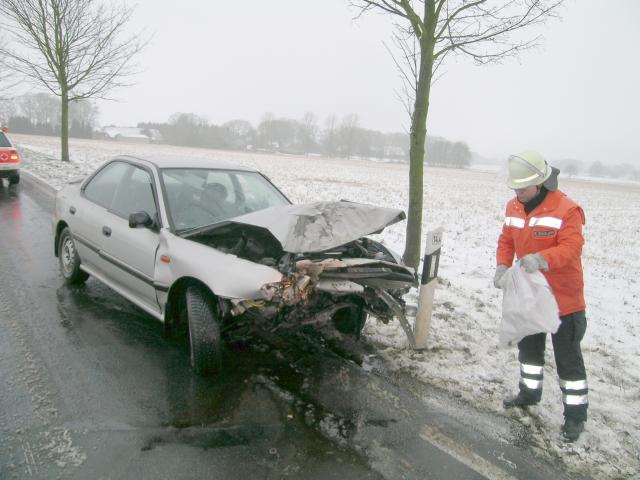 Der 20-jährige Fahrer eines silbernen Subaru war bei Schneematsch auf der L250 unterwegs als er plötzlich von der Fahrbahn abkam, quer über die Straße schleuderte und mit einer massiven Pappel frontal kollidierte. Von dieser prallte er jedoch wieder ab und rutschte zurück auf seine Fahrbahn, wo der Wagen dann zum Stehen kam.