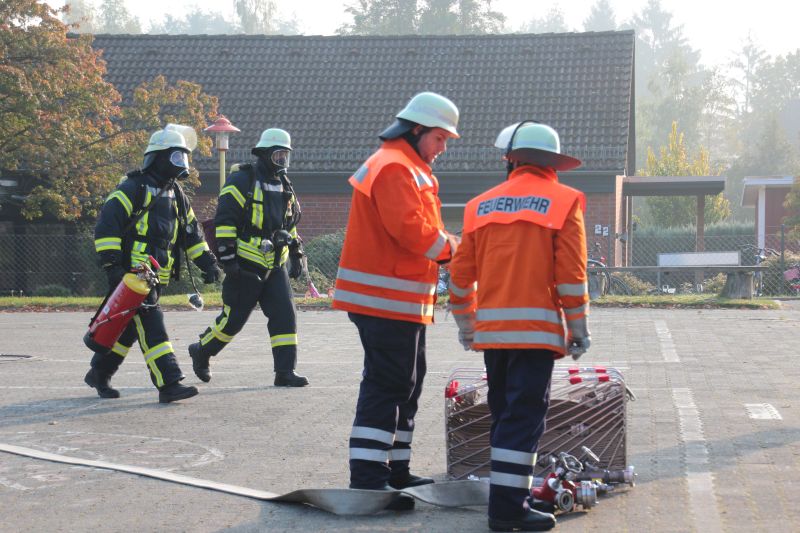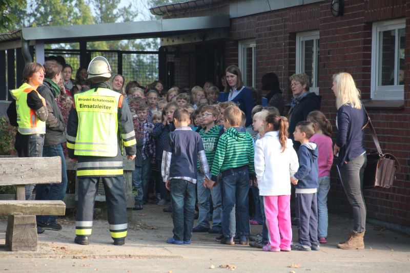 Die Schüler mit ihren Lehrerinnen verließen unmittelbar danach das Schulgebäude über die Notausgänge und fanden sich am Sammelplatz auf dem Schulhof ein. Hier wurde durch die kommissarische Leiterin der Grundschule Frau Liebmann die Vollzähligkeit der Schüler und Lehrkräfte festgestellt. Nach dem Eintreffen vom Tanklöschfahrzeug wurde dem Einsatzleiter mitgeteilt, dass sich keine Personen mehr in der Schule befinden. Der Einsatz beschränkte sich somit auf das Auffinden und Ablöschen der Brandstelle. Dabei kam auch die Wärmebildkamera der Wehr zum Einsatz. Nach dem Ablöschen und dem Belüften des Gebäudes wurde die Übung beendet.