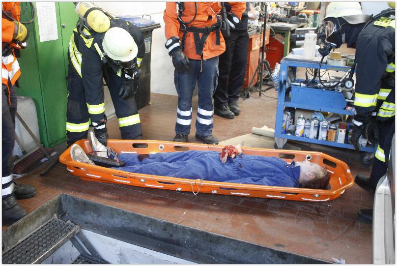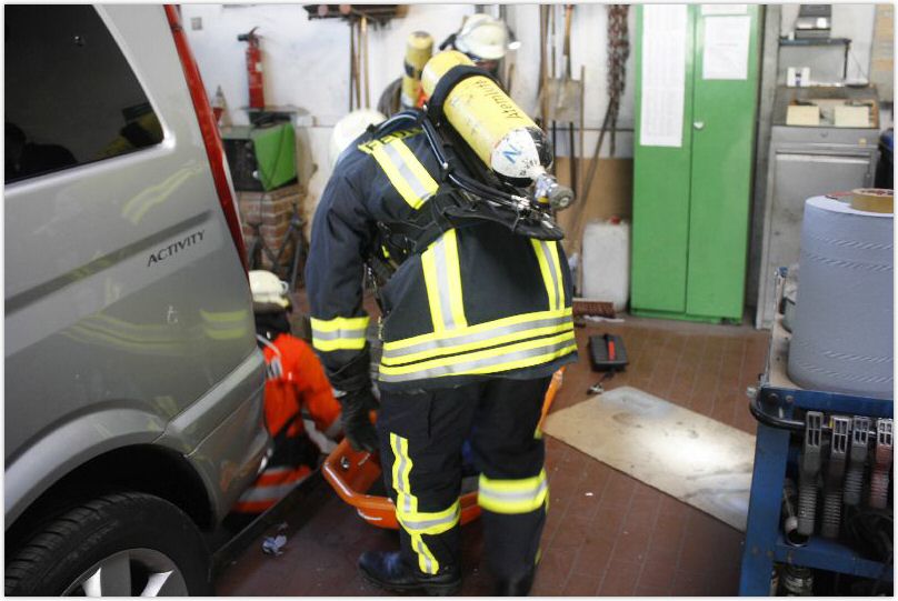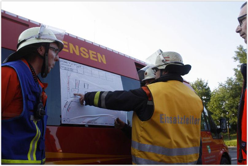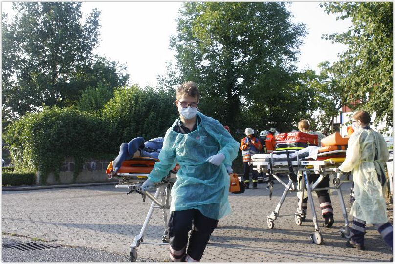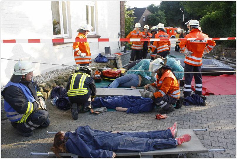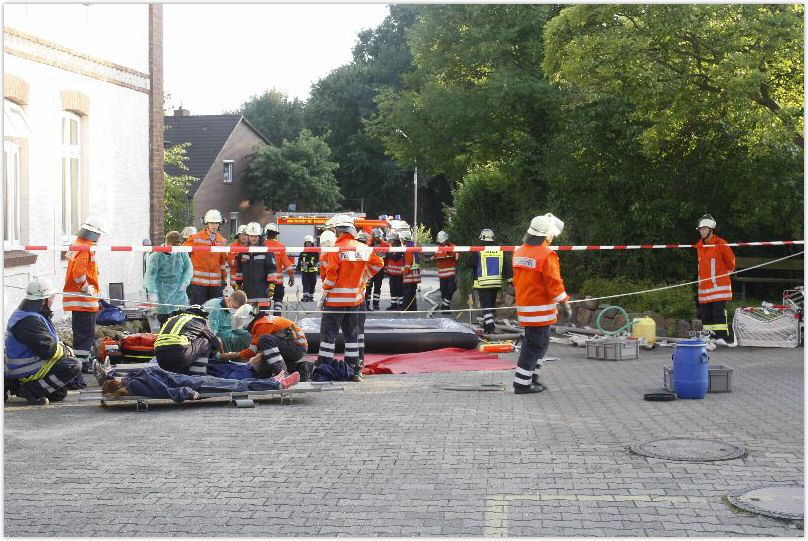 Schwerpunkt der Übung lag in der Zusammenarbeit des Gefahrgutzuges Nord der Feuerwehr mit der SEG (Schnelleinsatzgruppe) des DRK.