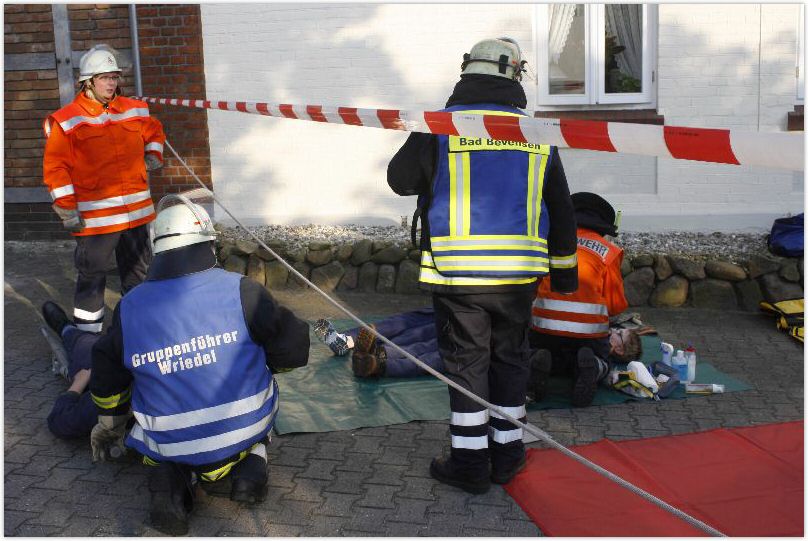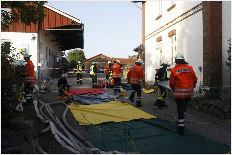 Ein großes Aufgebot an Feuerwehr und DRK Einsatzkräften war am 17.07. in Wriedel im Einsatz. In einer Kraftfahrzeugwerkstatt kam es nach einem Arbeitsunfall zu einem unkontrollierten Gasaustritt mit mehreren Verletzten. Glücklicherweise war dies nur eine Übung, aber gerade solche Szenarien müssen immer wieder auch in großen Verbänden geübt werden.