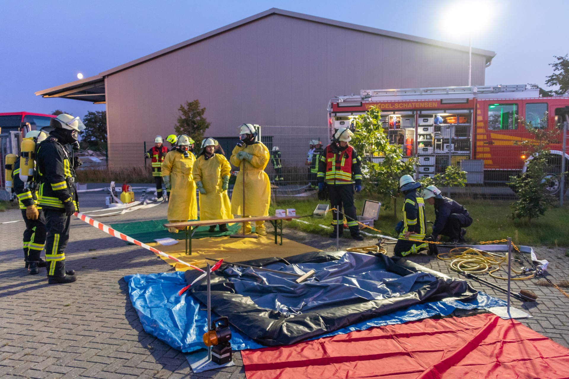 Parallel dazu wurde die Wasserversorgung bis zur Gefahrengrenze und eine Notdekontamination aufgebaut. Da es sich hier um einen auslaufenden Gefahrstoff handelt, wurde über die Einsatzleitung der Gefahrzug Nord alarmiert.