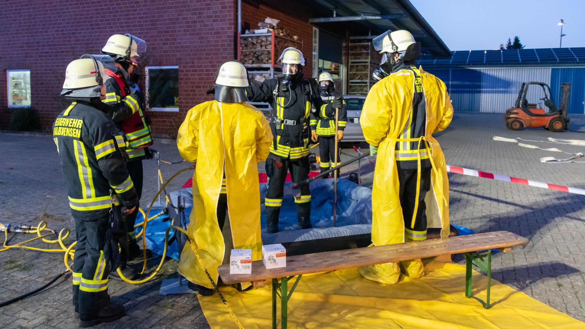 Der inzwischen eingetroffene Gefahrgutzug, bestehend aus den Wehren Ebstorf, Bad Bevensen, Bienenbüttel und Wriedel, unter der Führung von Zugführer Timo Schärling, wurde in die Lage eingewiesen. Durch die Besatzung vom ELW Bad Bevensen wurden weitere Stoffinformationen eingeholt und es wurde eine Dekontaminierungsstation aufgebaut. Nach der Ermittlung der Stoffe wurden zwei Trupps unter CSA zu der Unglücksstelle entsandt, um den leckgeschlagenen Behälter zu verschließen und die drei anderen mit Schuttmulden zu bergen.