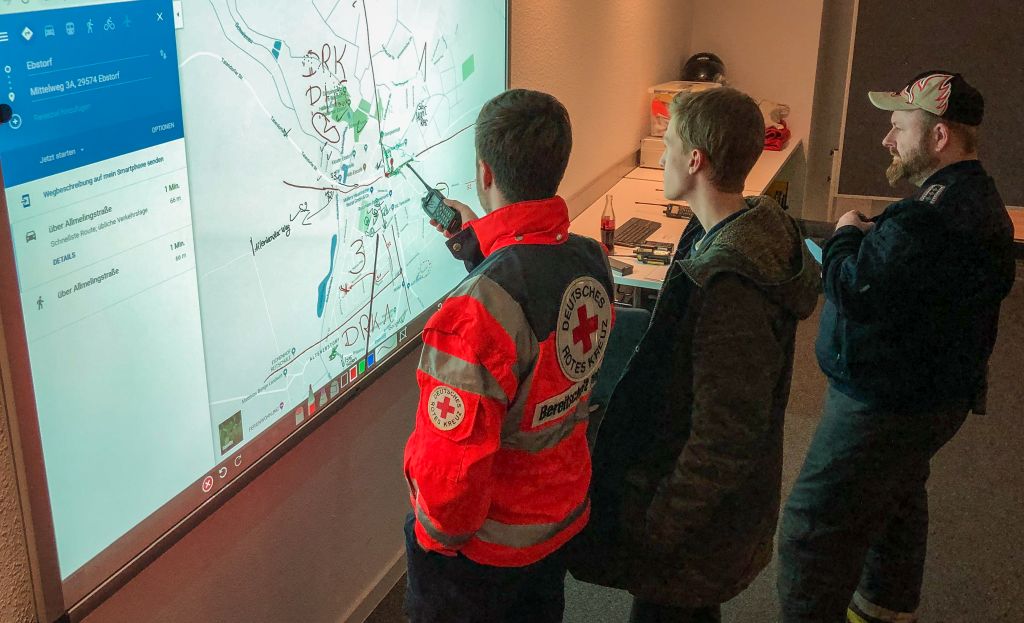 Eine angenommene Personensuche im Klosterflecken musste durch die Besatzungen der drei Einsatzleitwagen (ELW) vom DRK sowie der Feuerwehren Ebstorf und Wriedel-Schatensen abgearbeitet werden. Hier galt es unter anderen die verschiedenen Einheiten wie die Rettungshundestaffel, die Drohne mit ihrer Wärmebildkamera und die einzelnen Feuerwehreinheiten zu koordinieren.