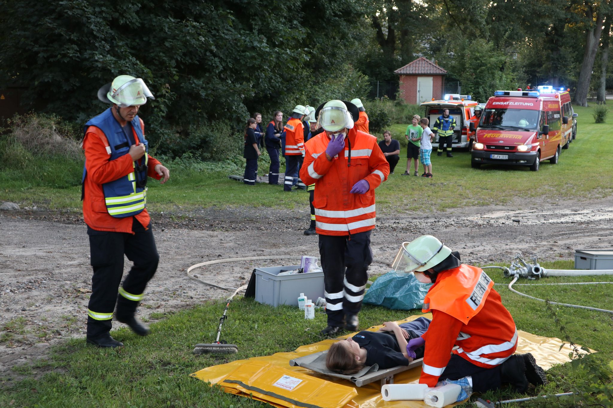 In der Nachbesprechung am Gerätehaus der Feuerwehr Brockhöfe wurde das von den Ortsbrandmeistern Olaf Venske und Hans Werner Gade vorbereitete Übungsscenario vom Zugführer Mirko Feldmann ausdrücklich gelobt.