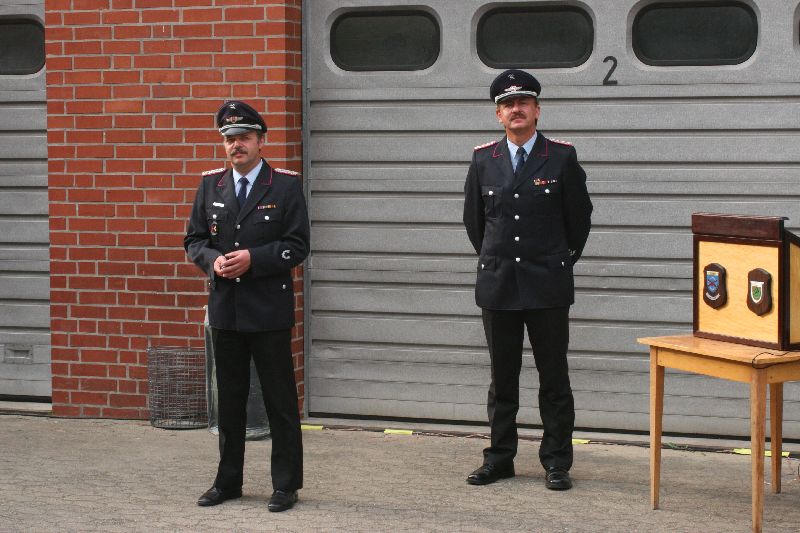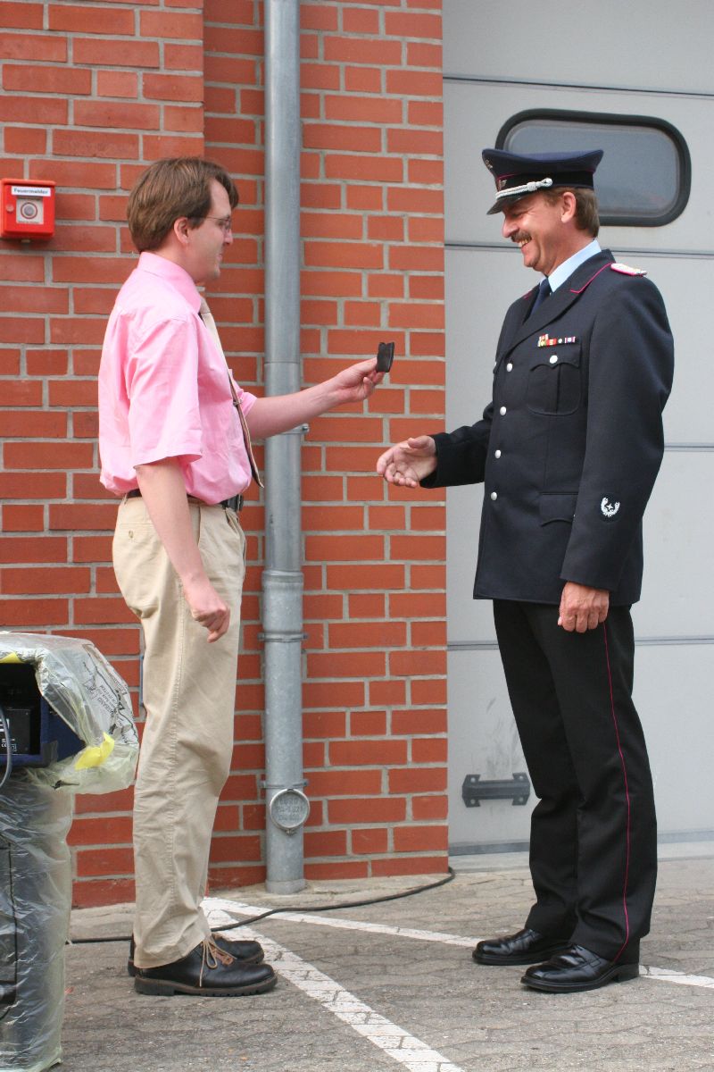 Bevor der Gemeindebrandmeister Hans Jürgen Cordes den Schlüssel an den Ortsbrandmeister Hans Werner Gade überreicht, betonte er das es bei der heutigen Finanzlage der Kommunen nicht mehr selbstverständlich ist, für die Feuerwehr Neufahrzeuge zu beschaffen.
