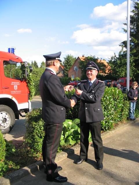 Bevor der Ortsbrandmeister Hans Werner Gade den Schlüssel für das neue Fahrzeug aus den Händen vom Gemeindebrandmeister Hans Jürgen Cordes erhielt, dankte er allen Beteiligten für die gute, konzentrierte und zielgerichtete Zusammenarbeit. Dieses Fahrzeug trägt im erheblichen Maße dazu bei die Sicherheit der Bürger in Land und Gemeinde zu erhalten und zu verbessern.