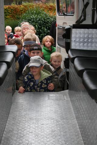 Am nächsten Tag den 08.11.05 stand ein ungleich umfangreicheres Programm für die Brandschützer auf dem Programm. Diesmal waren sie zu Besuch im Kindergarten und hatten 62 Kinder zu unterweisen. Die Kinder wurden in drei Gruppen aufgeteilt, jede Gruppe wurde von einem Brandschützer betreut.
