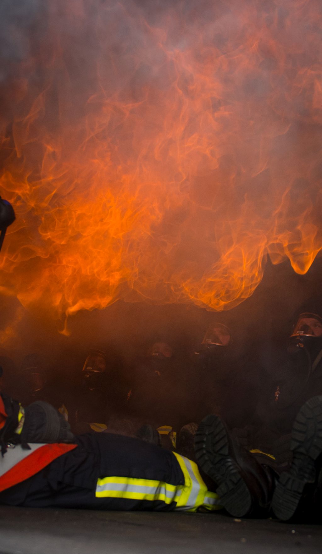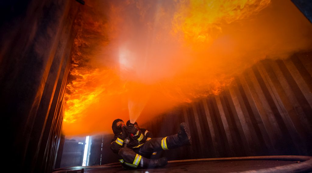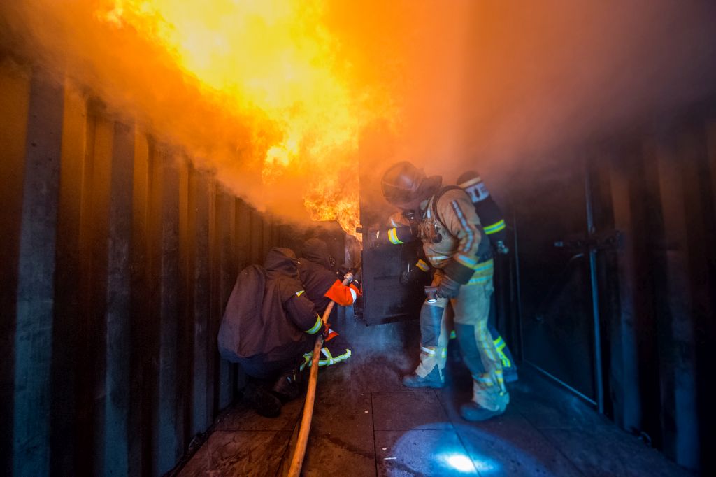 Im Container selber werden genau diese Rauchgasdurchzündungen provoziert, allerdings sitzen die Teilnehmer gut 40 cm tiefer als der Raum in dem die Holzpaletten verbrannt werden. In dieser Zone herrschen Temperaturen von etwa 70 bis 80 Grad. Im Deckenbereich können es bis zu 800 Grad sein. Die erste Lektion wird den Teilnehmern nach der ersten Durchzündung schnell klar. Je tiefer man sich aufhält umso kühler ist es. Ohne ihre Schutzkleidung wäre ein Überleben in diesem Bereich nicht möglich.